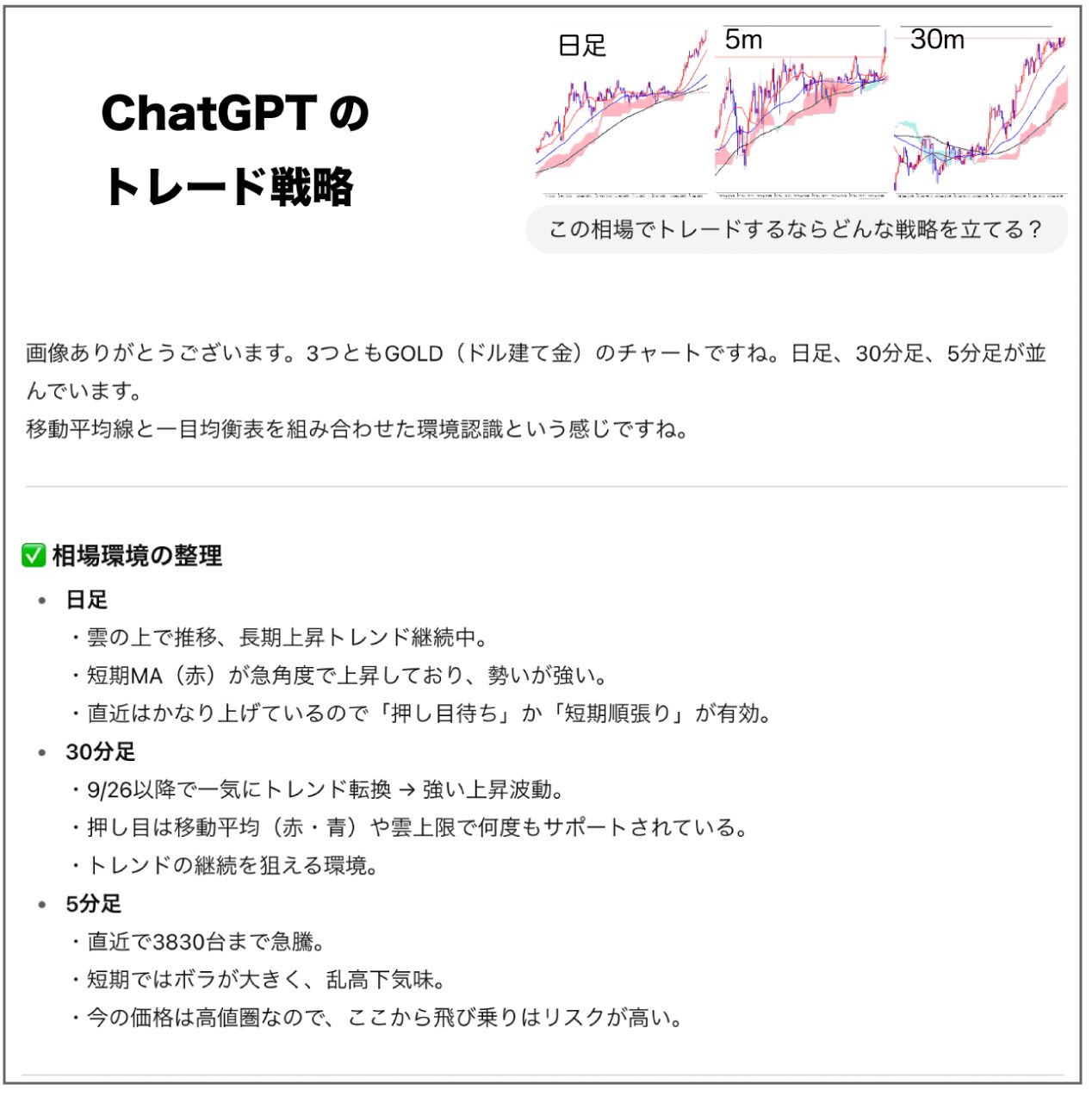 今回ChatGPTにはゴールドの日足、30分足、5分足をそれぞれ見てもらい、そこから戦略を考えてもらいました(・∀・)