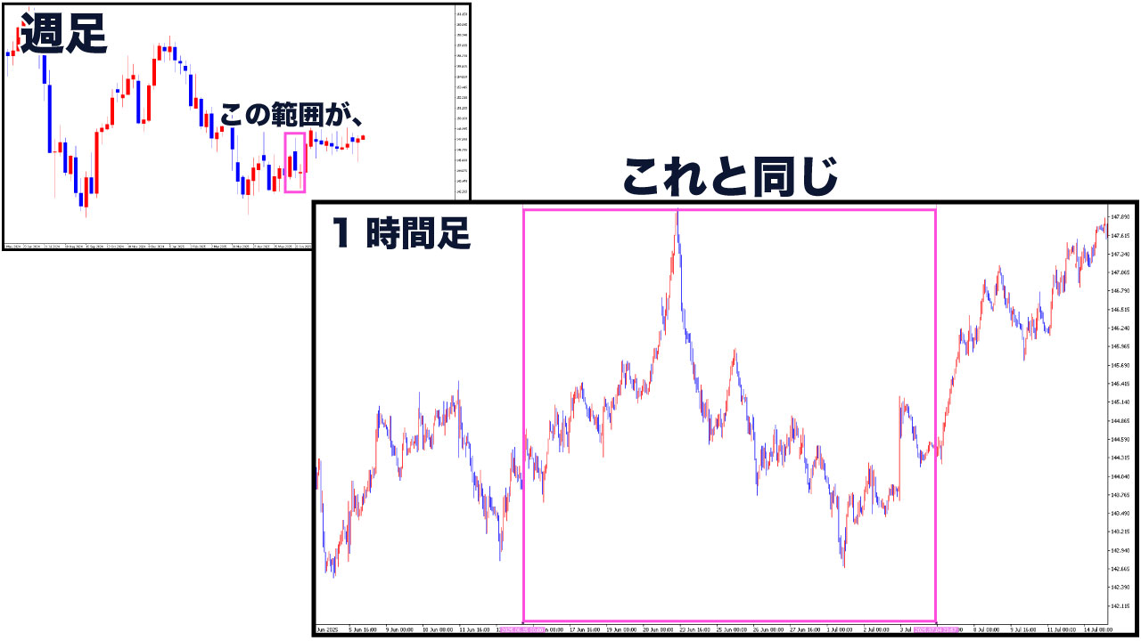 まず、チャートの日足や1時間足などの各時間足は、以下のように拡大・縮小の関係にあることを認識しておきましょう。