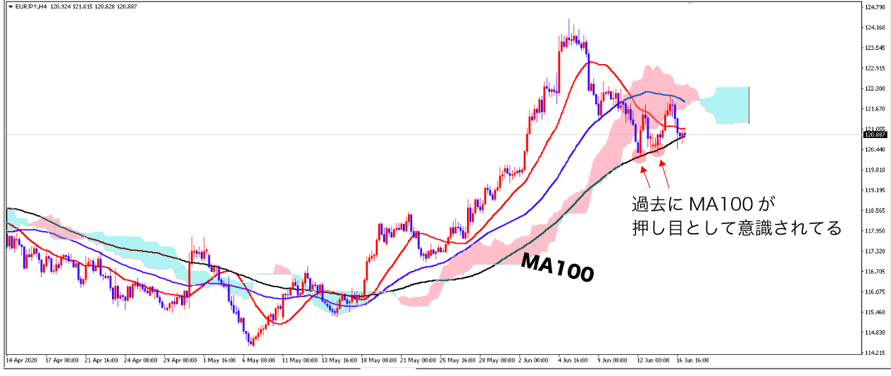 この4時間足は“まだ”上昇トレンドで、MA100が過去に押し目として意識されていますね(・ω・)
