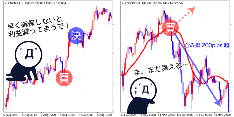 この心理が働くと、自然と利益は小さく(利小)、損失は大きく(損大)なりがちです。これが有名な「コツコツドカン」で資金を失う典型的なパターンです。