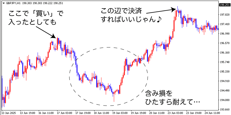 これは、損切りを先延ばしにする行為に他ならず、トレンドが戻らなかった場合に損失を爆発的に増大させる非常に危険な行為です。