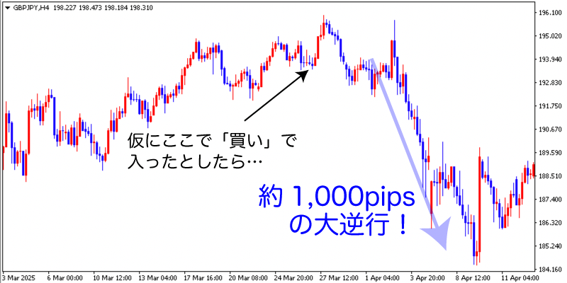 場合によっては一撃で1,000pips以上の含み損なんてこともありえます。