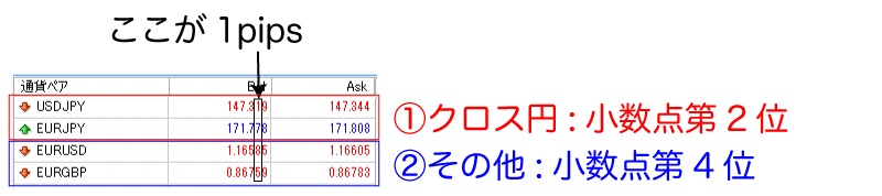 具体的に1pipsとはどこの数値なのかというと、「クロス円(円=JPYが含まれる通貨ペア)」「その他」かで異なります。