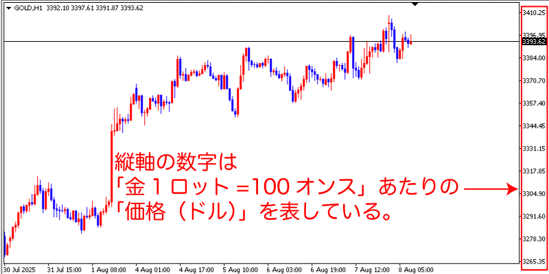 通貨ペアと異なる部分として、ゴールドの場合、1ロットは100オンスを意味します。(海外FXでも国内FXでも共通)